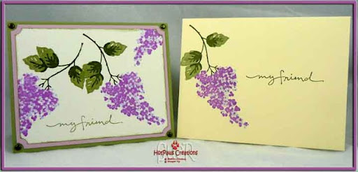 This Two Step Stampin' set; "Blossoms Abound" was really a big winner. All but one person ordered the set. I apologize for the yellow appearing envelope. It really is more of a linen color. It just came out a bit more yellow in the photo. The party was a huge success! All total merchandise sales were over 1,300. There were 10 people (mostly family) of this gal and they all really wanted to help her get free merchandise. I even goofed on an order and missed and item on one of the receipts and had to call the gal's mother back to tell her and she ordered $100. 00 more in product!! Unfortunately no one wanted to book another party but this one was good so I can not complain! I really had forgotten how pretty this set can be. Paper used was Mellow Moss & Pale Plum. Inks were Classic Almost Amethyst & Orchid Opulence for the Lilacs and Always Artichoke & Mellow Moss for the sentiment, leaves and branches . Antique Brads and the Ticket Corner punch were used for the corners.